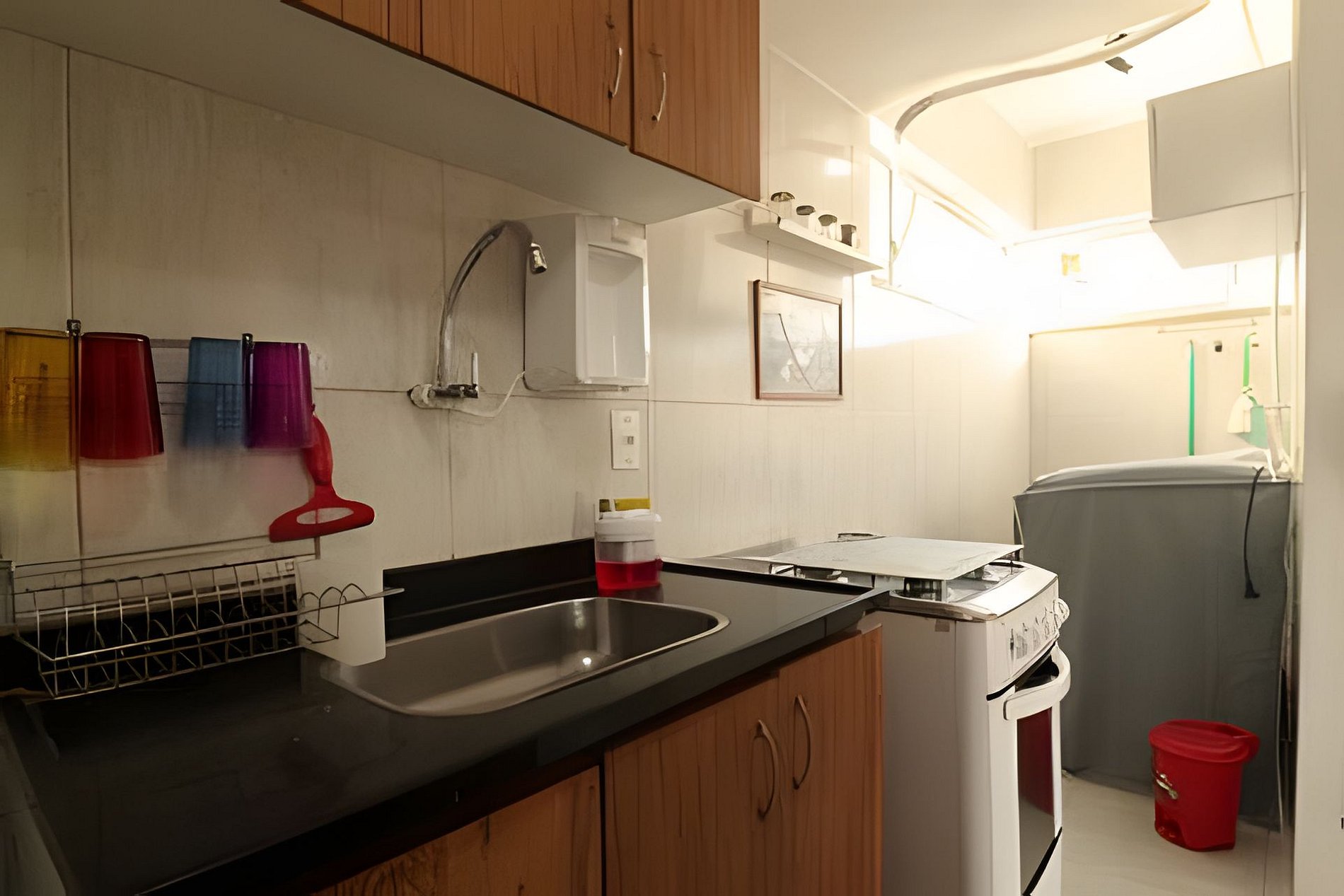 A cozinha é completa, equipada com fogão com forno, geladeira, máquina de lavar roupas e todos os utensílios necessários para preparar suas refeições com tranquilidade.