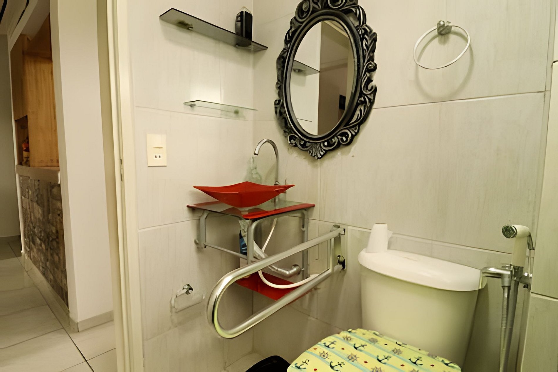 O quarto dispõe de uma cama de casal e uma cama de solteiro, além de ar-condicionado e guarda-roupa para maior comodidade. O banheiro é funcional e bem cuidado, atendendo a todas as necessidades.