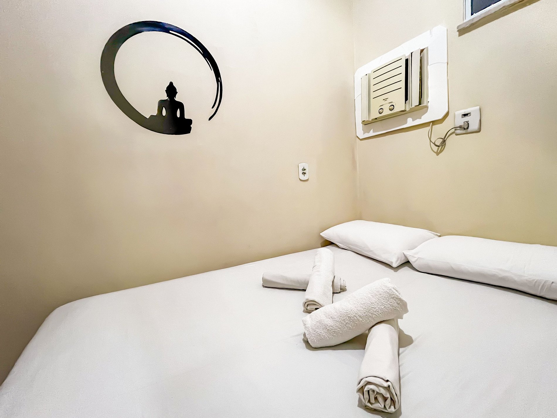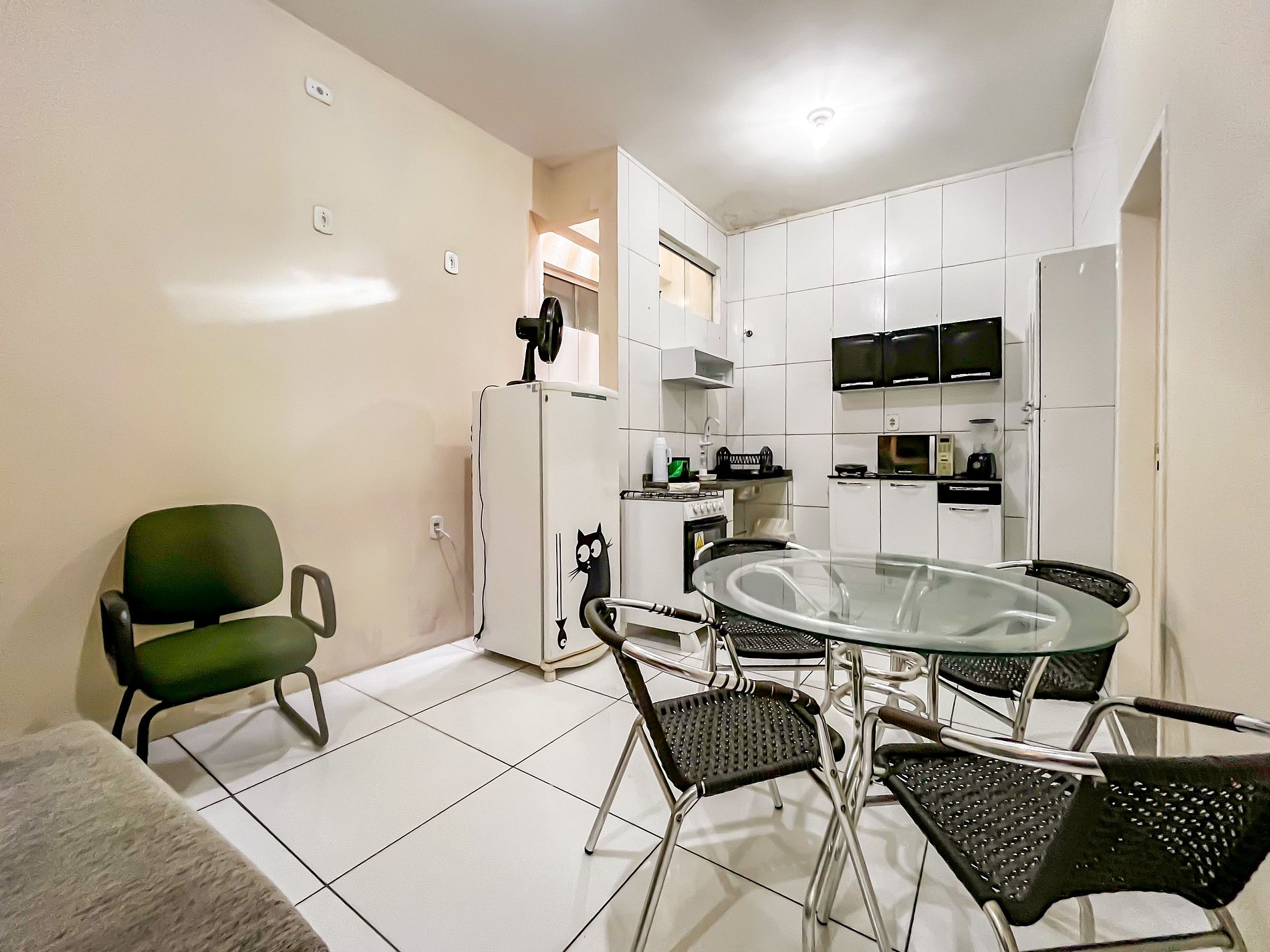 Típico prédio de dois andares, com um lance de escada de 15 degraus, em uma das principais avenidas da cidade que da acesso a Orla de Atalaia e as mais famosas praias. O flat possui dois quartos, ambos com ar-condicionado, um com uma cama box casal e guarda-roupas e o outro com duas camas box de solteiro e cômoda. O espaço possui ainda sala de estar com sofá e cadeiras, televisão 32 polegadas, cozinha integrada toda equipada com utensílios básicos (peneira, espremedor, sal, óleo, pimenta e etc), panelas, pratos, bandeja, facas e talhares, fogão, microondas, geladeiras, cafeteira, sanduicheira e mesa. Área de serviço com tanquinho e espaço com varal pra estender roupas. O banheiro é bem agradável com roupas de banho e sabonete à disposição. A linda e arejada cobertura privativa no andar superior é perfeita para uma gostosa confraternização entre os hóspedes previstos na reserva.