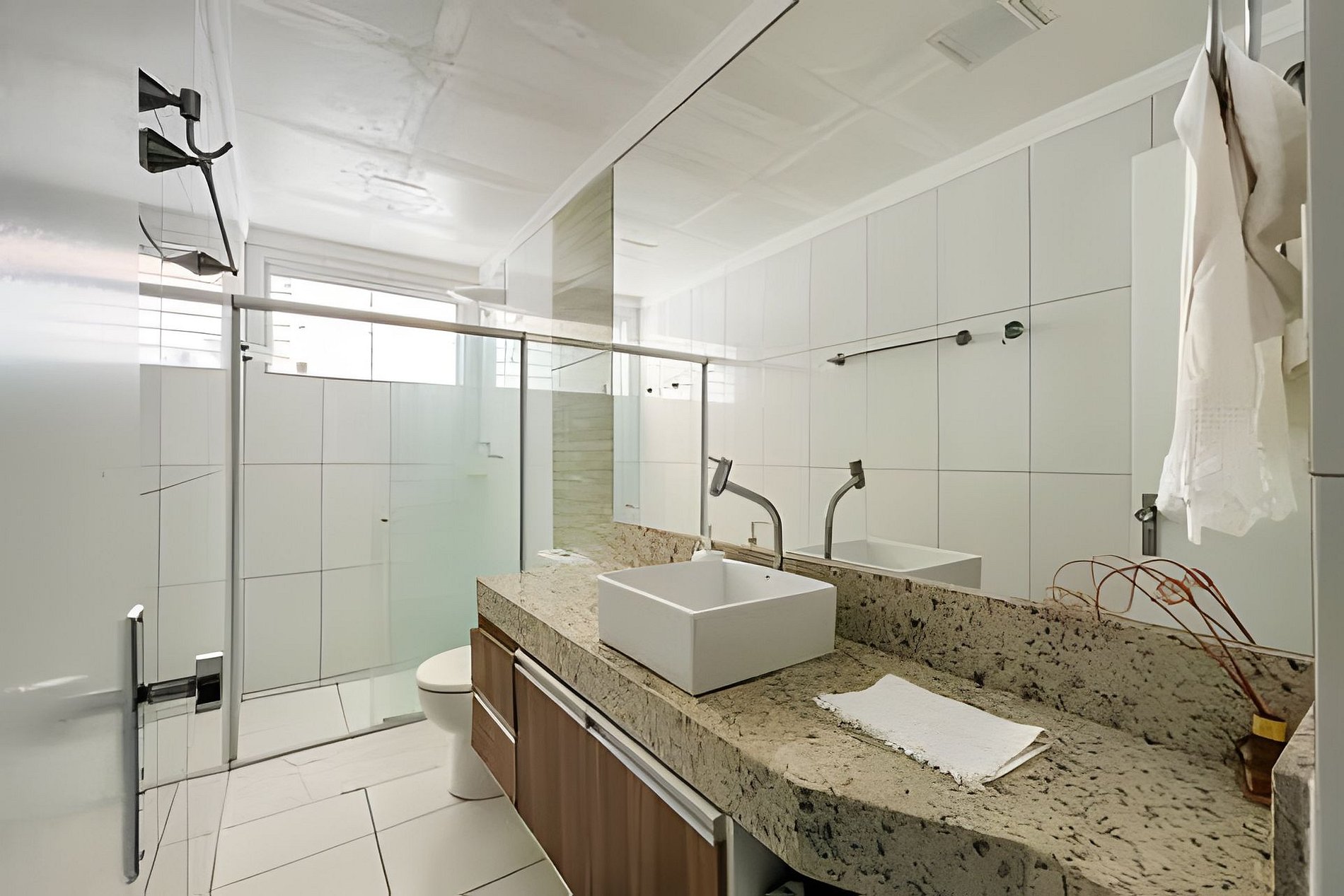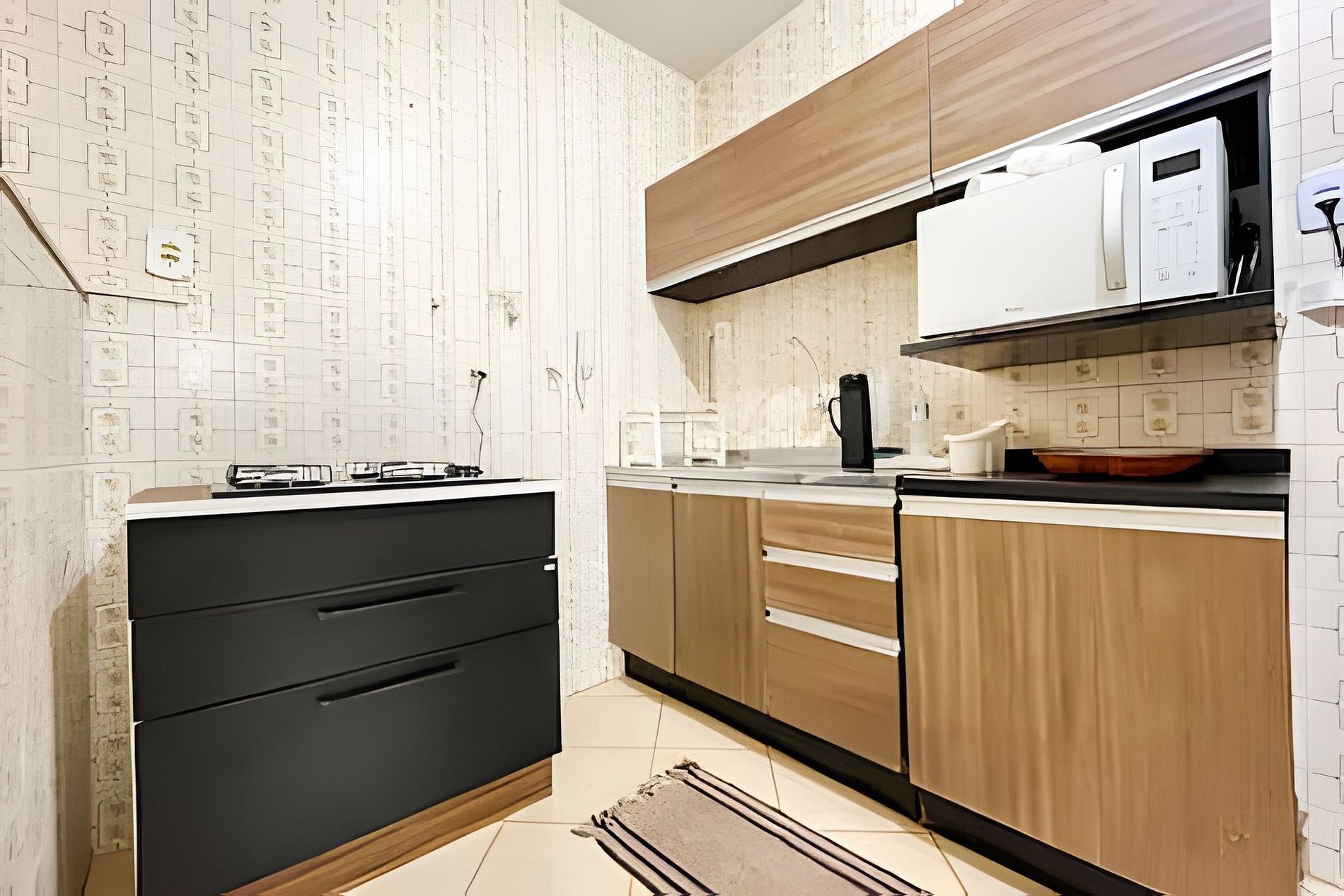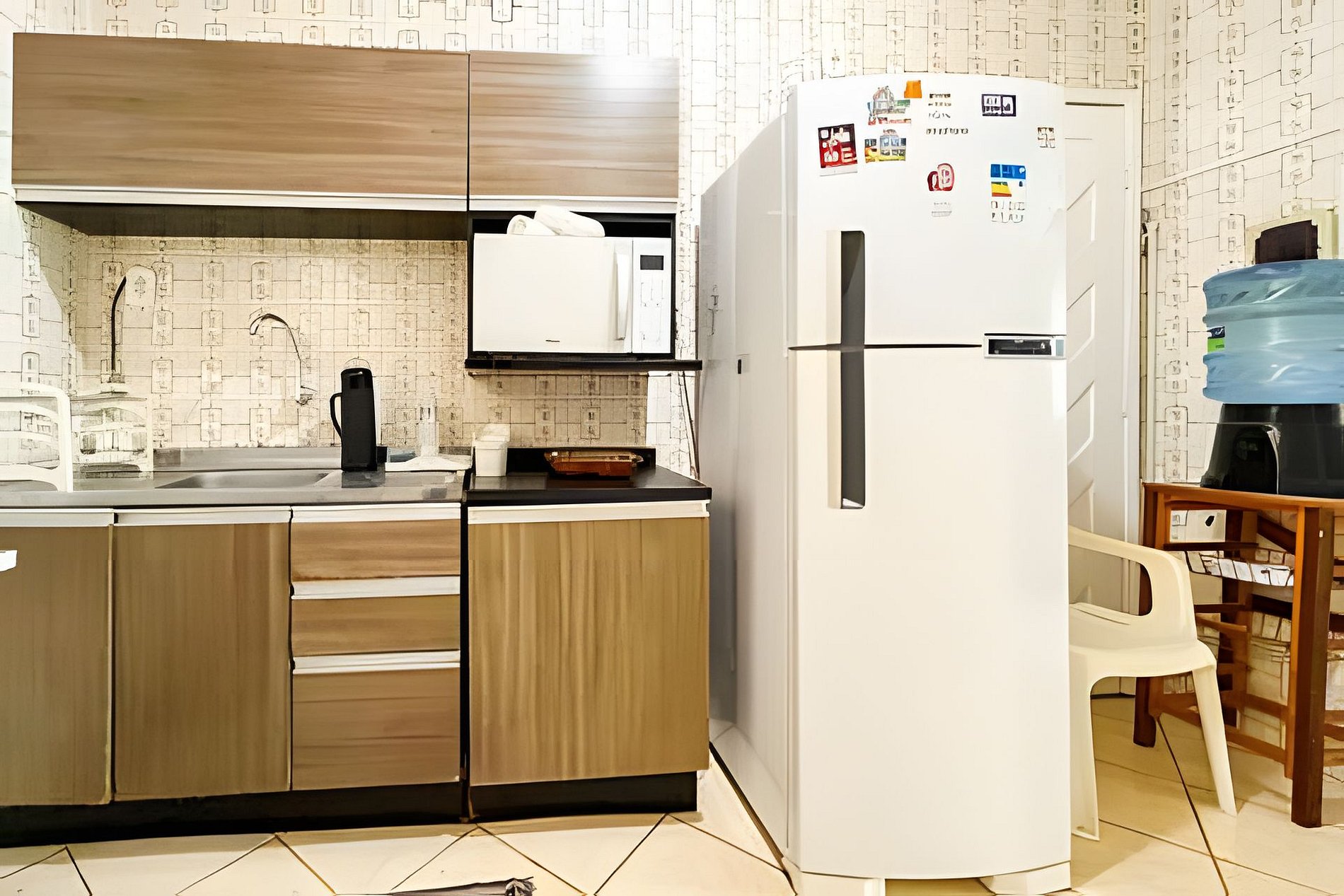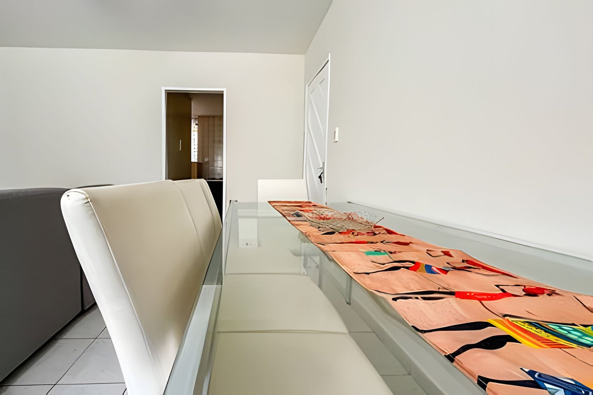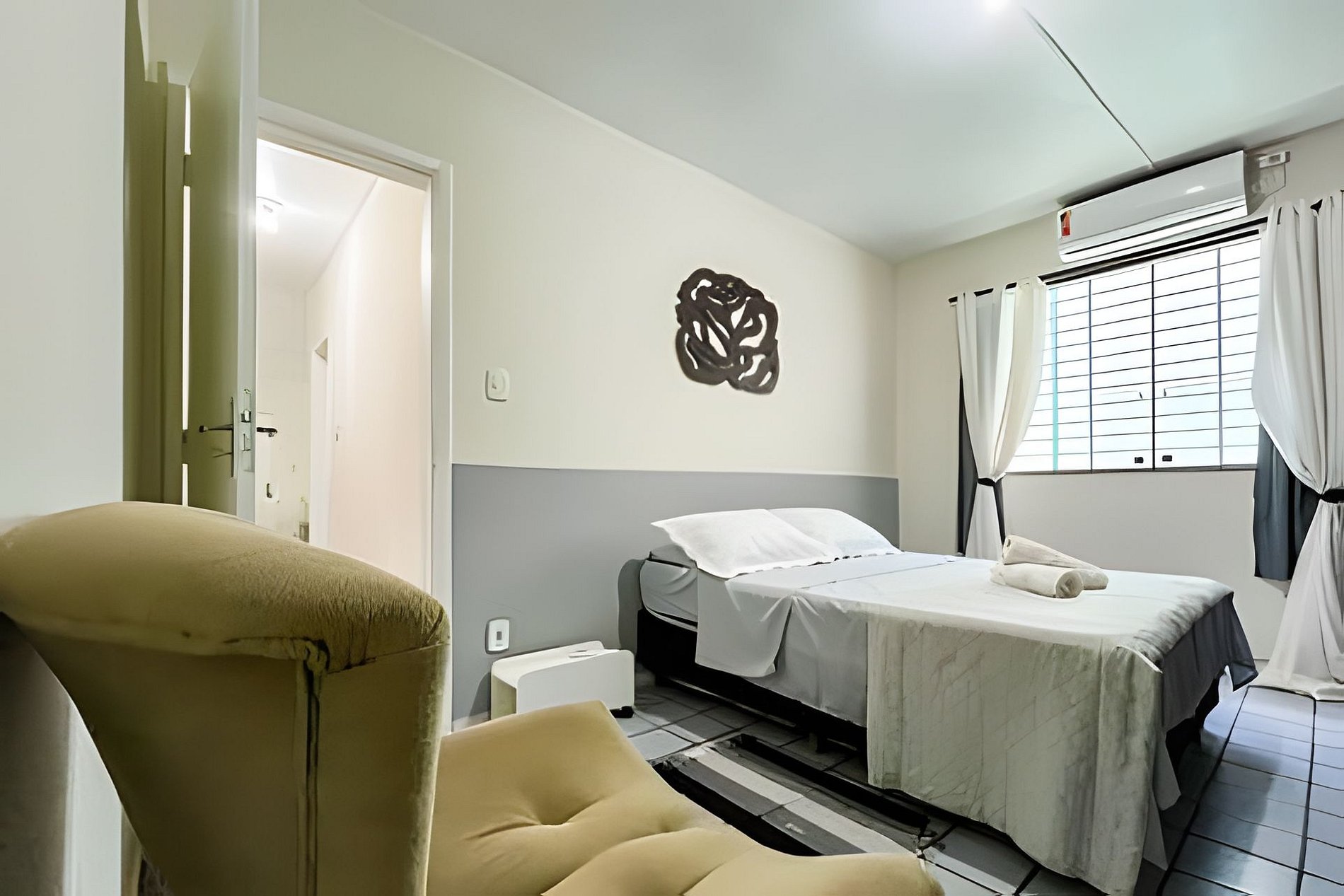 Espaço confortável com três quartos sendo um suíte, todos com cama de casal e com ar-condicionado. Ampla sala de estar com sofá, hack, TV SMART 32’ e ventilador. Sala de jantar com mesa e 4 cadeiras. Internet muito boa. Cozinha totalmente equipada com utensílios básicos para a preparação de variados alimentos, contando com geladeira duplex, fogão e microondas. Nossa área de serviço conta com máquina de lavar roupas, pia lavanderia, varal e acesso ao terceiro banheiro. Total de três banheiros no apartamento sendo todos deles com box, dois com chuveiro elétrico e espelho. Uma vaga de garagem a disposição com controle do portão eletrônico a disposição do hóspede.
