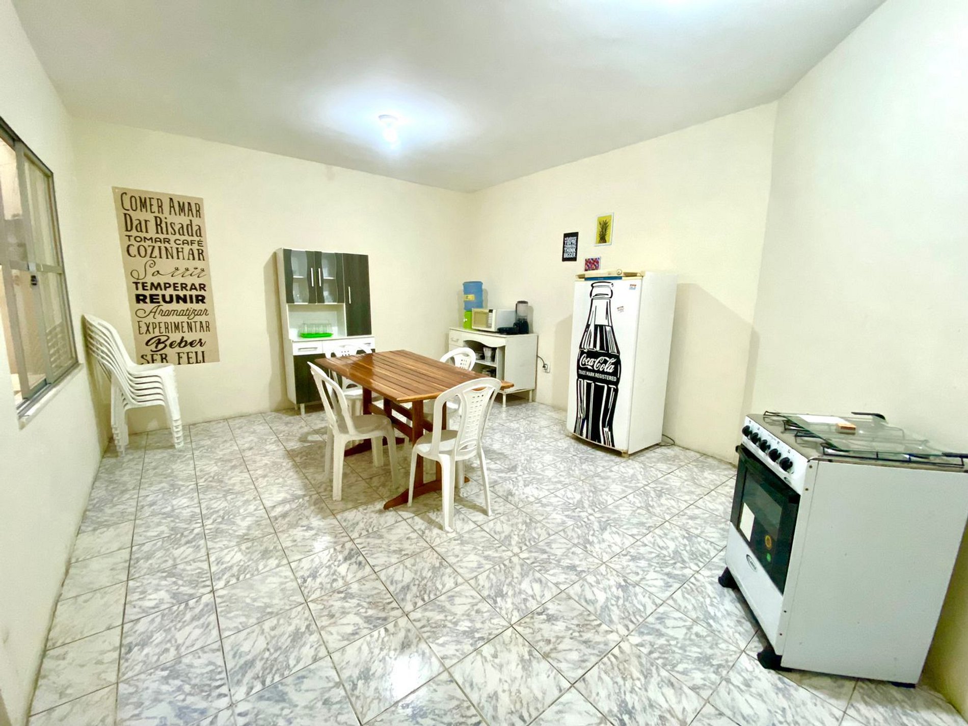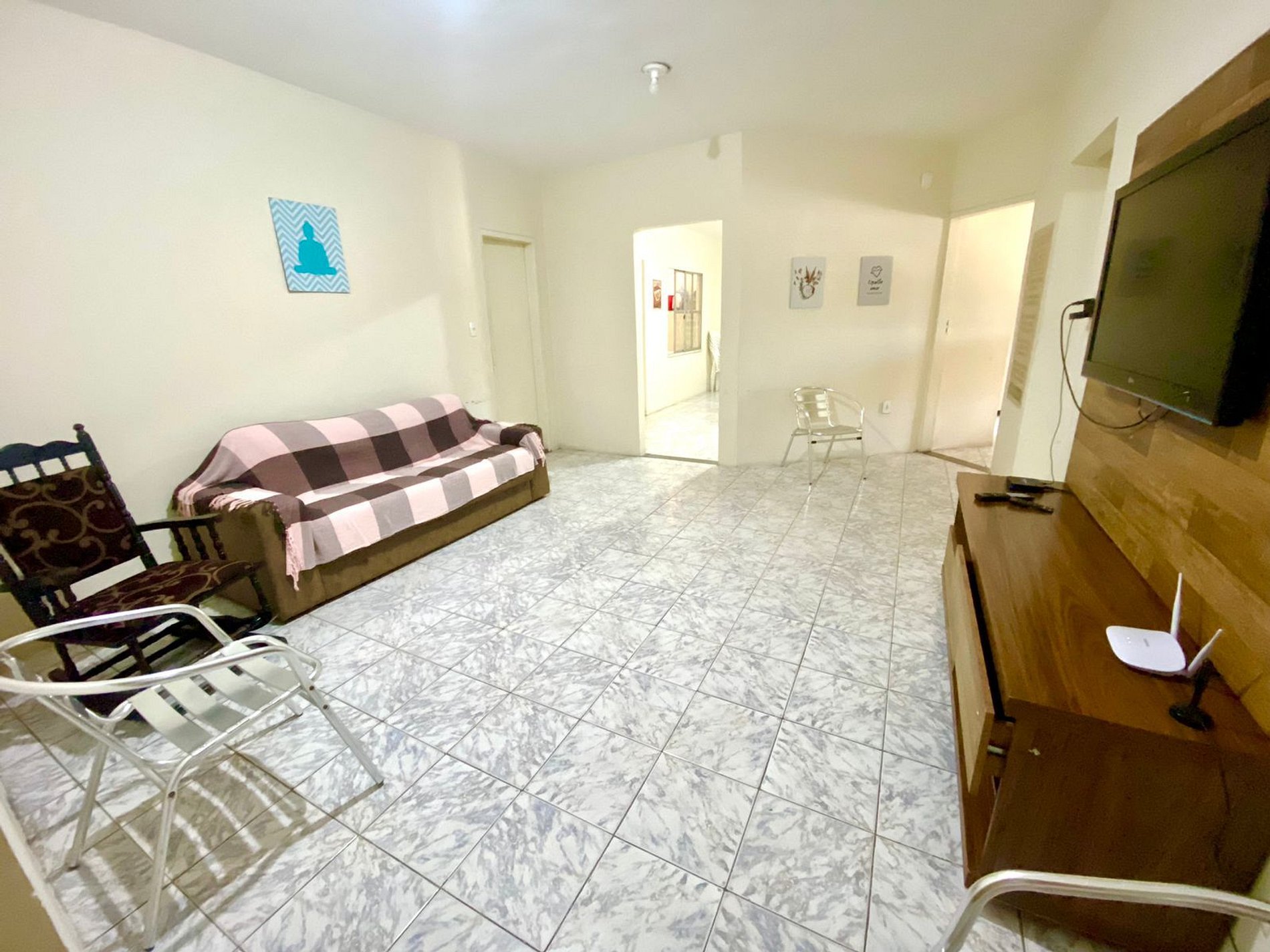 A casa fica em um primeiro andar, sendo necessário subir um vão de escada com aproximadamente 15 degraus, ainda com corrimão a disposição. O local se faz bastante arejado, fruto das amplas janelas presentes e da frente livre de outros imóvel, onde há uma grande praça e importante avenida da cidade que liga diretamente a Orla de Atalaia. Possuímos três quartos, sendo um deles bastante amplo, com suíte, uma cama beliche, uma cama casal e uma cama solteiro. Outro quarto possui três camas de solteiro, havendo mais um quarto com uma cama de casal a disposição. No total a casa possui dois banheiros, sala ampla com televisão e cozinha equipada com geladeira, fogão com forno, microondas, sanduicheira, liquidificador e todos os utensílios necessários para o bom funcionamento da mesma a disposição dos hóspedes. Todos os quartos e sala possuem ventiladores de teto em ótimo estado de conservação.