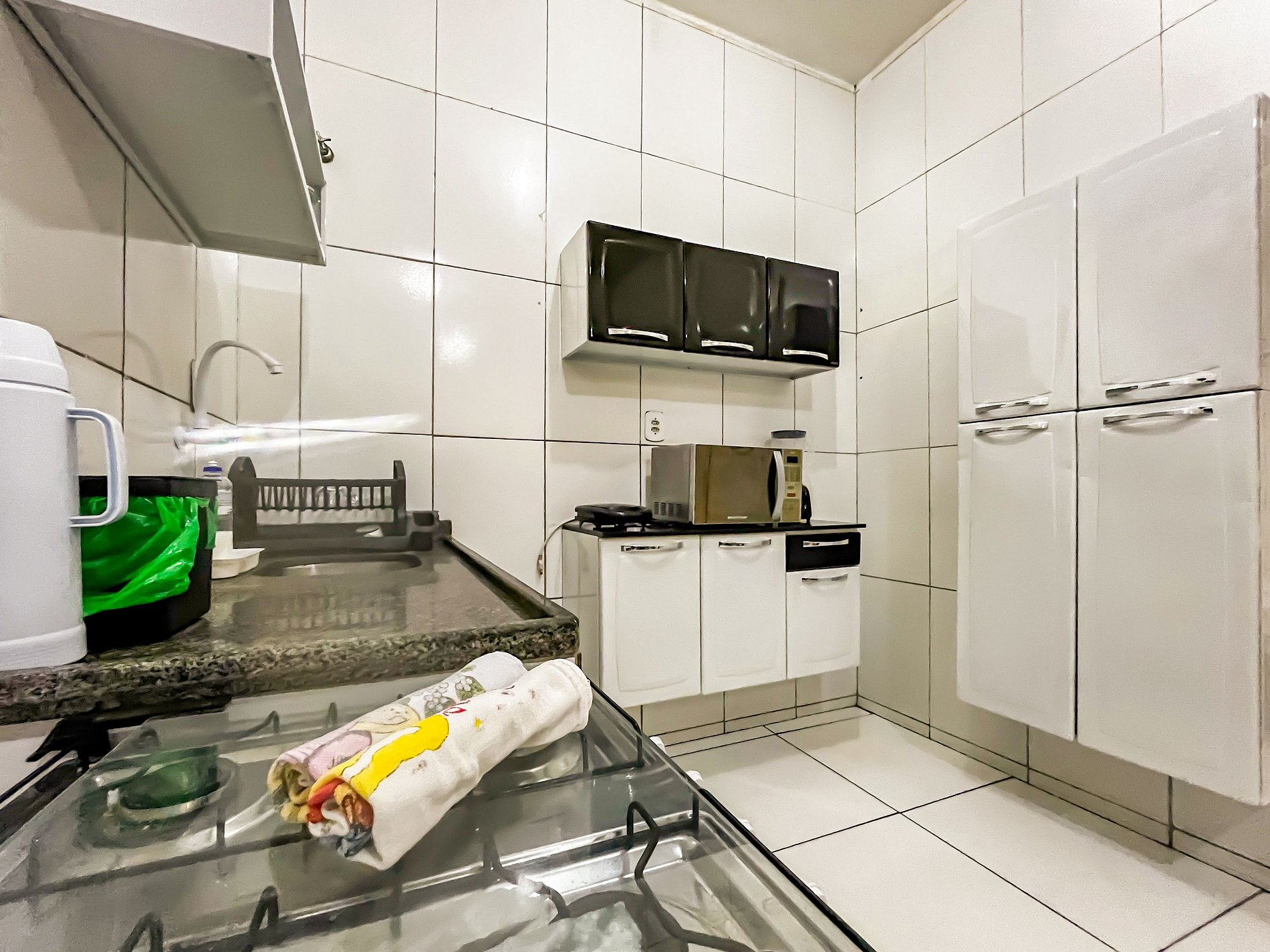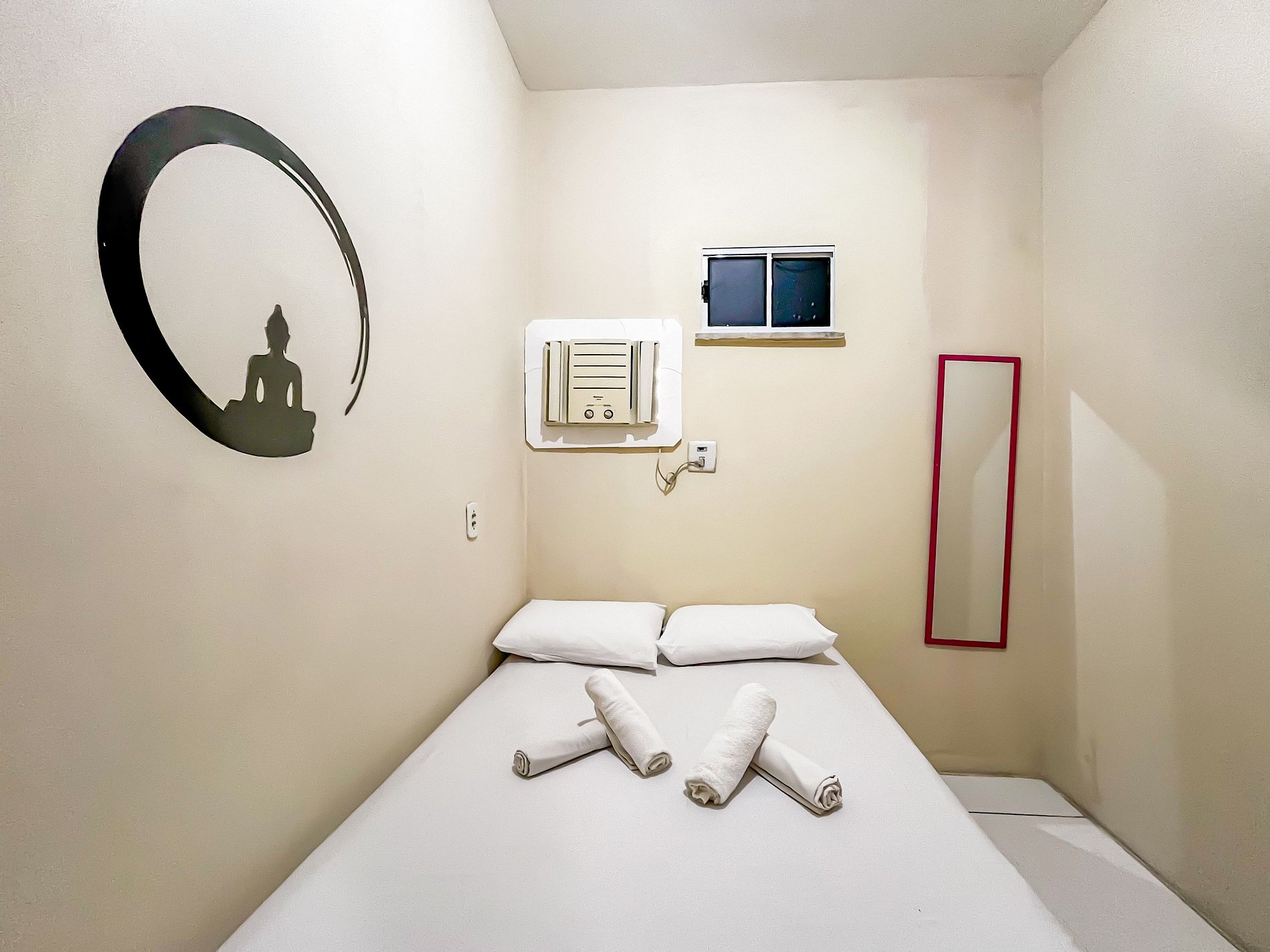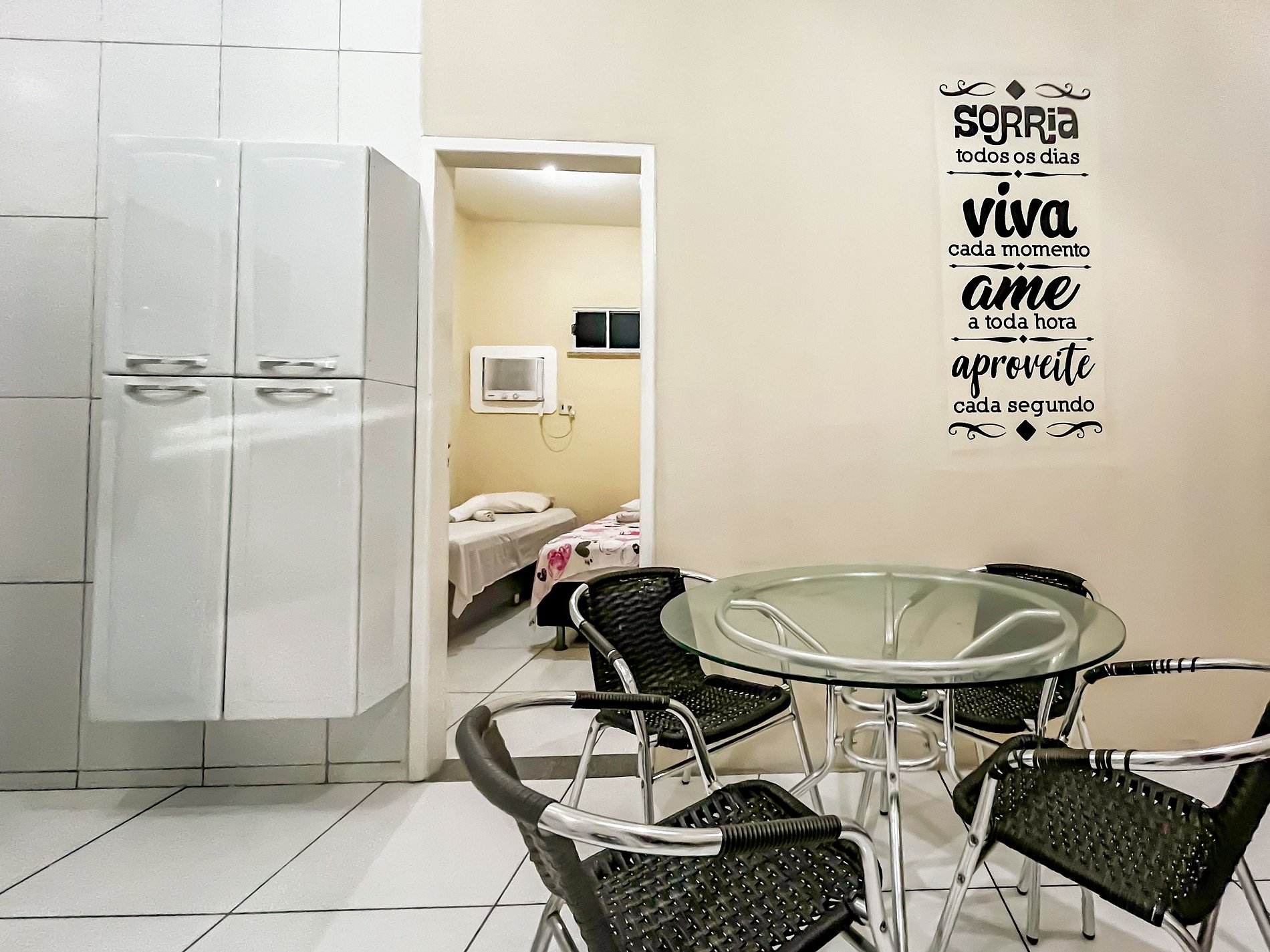 Típico prédio de dois andares, com um lance de escada de 15 degraus, em uma das principais avenidas da cidade que da acesso a Orla de Atalaia e as mais famosas praias. O flat possui dois quartos, ambos com ar-condicionado, um com uma cama box casal e guarda-roupas e o outro com duas camas box de solteiro e cômoda. O espaço possui ainda sala de estar com sofá e cadeiras, televisão 32 polegadas, cozinha integrada toda equipada com utensílios básicos (peneira, espremedor, sal, óleo, pimenta e etc), panelas, pratos, bandeja, facas e talhares, fogão, microondas, geladeira, cafeteira, sanduicheira e mesa. Área de serviço com tanquinho e espaço com varal pra estender roupas. O banheiro é bem agradável com roupas de banho e sabonete à disposição.