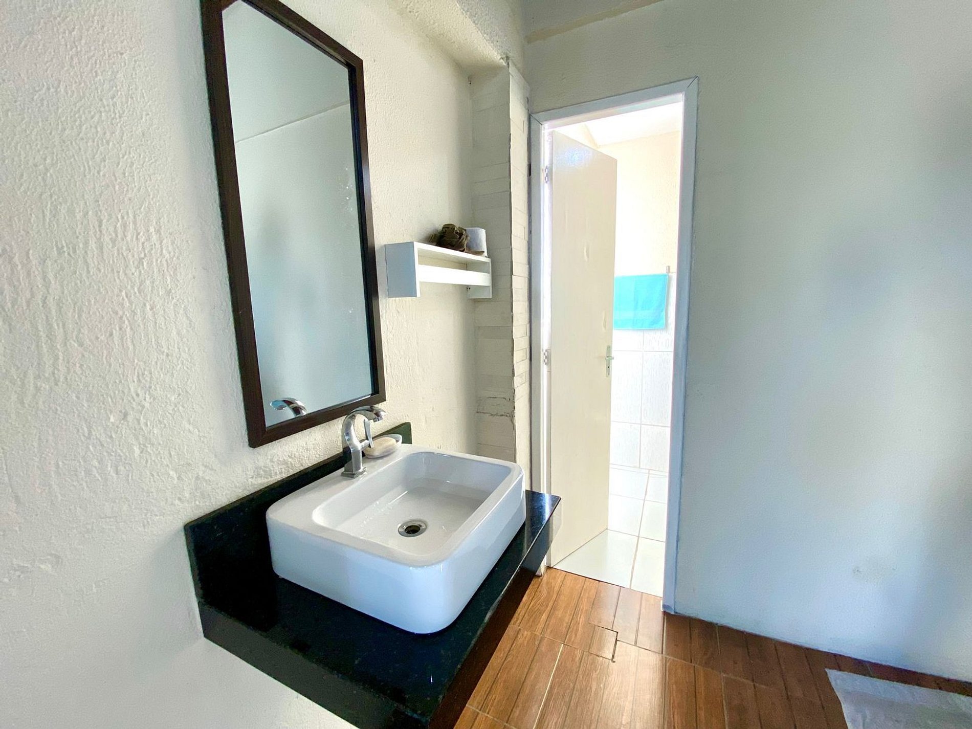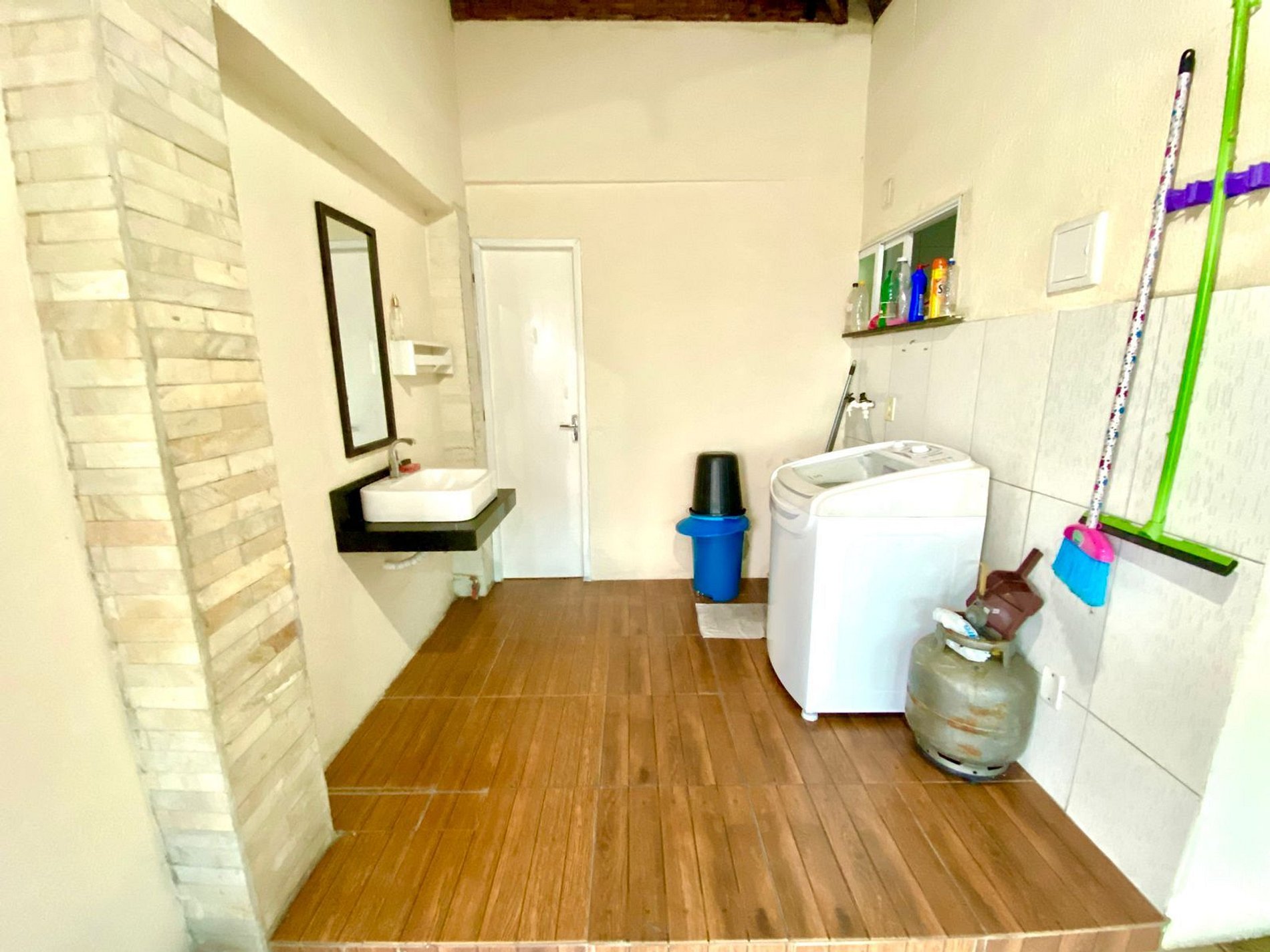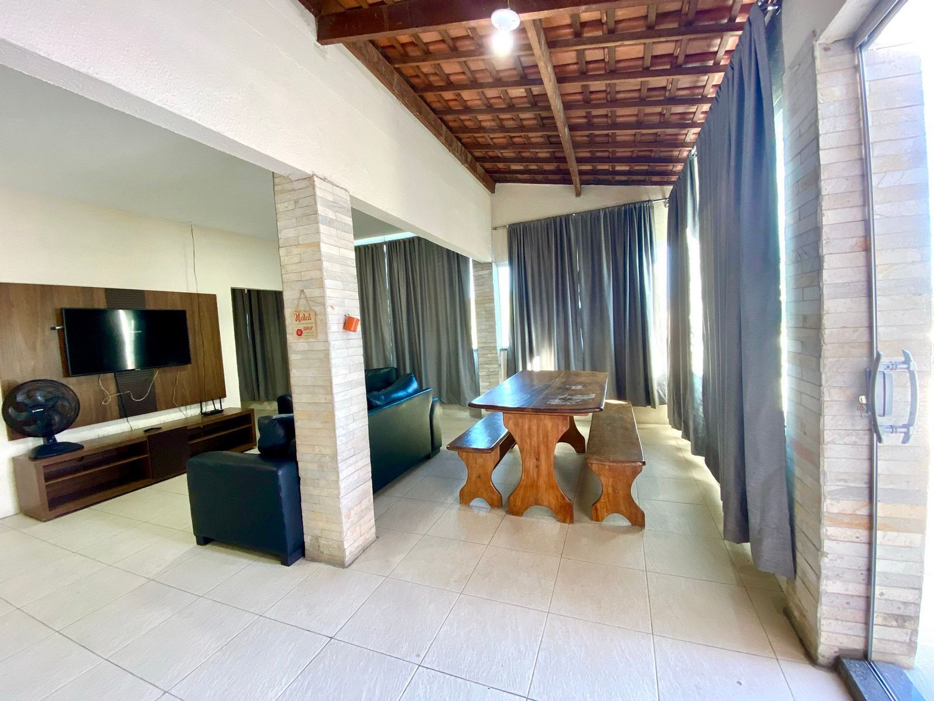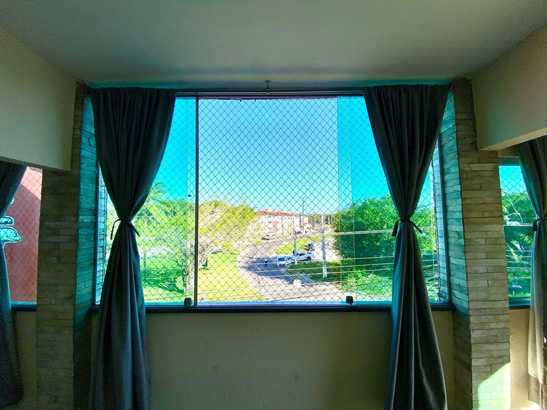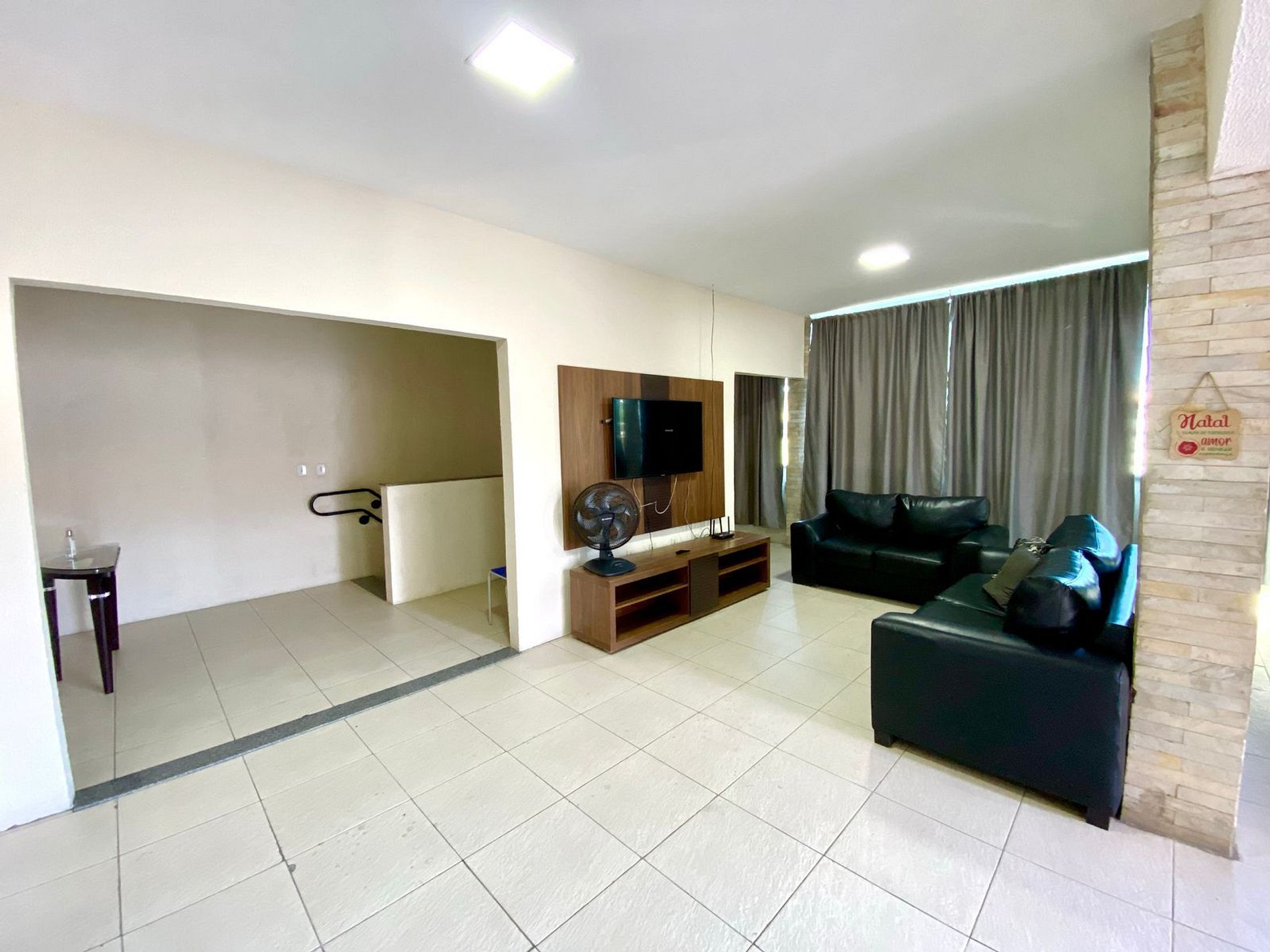 Casa em segundo andar com dois quartos, ambos suítes, com ar-condicionado e com duas camas de casal em cada um. A disposição ainda banheiro social que fica ao lado da área de serviço. O espaço conta com maravilhosa área aberta equipada com churrasqueira, mesa e cadeiras. Nossa sala de estar conta com sofás confortáveis, SMART TV 52’, e internet 200mb. Cozinha muito bem equipada disponível para o preparo de belas refeições. Contamos ainda com mesa de jantar. Para o conforto dos pais e maior segurança com as crianças instalamos tela de proteção nas janelas e porta de vidro para impedir o acesso a área aberta.