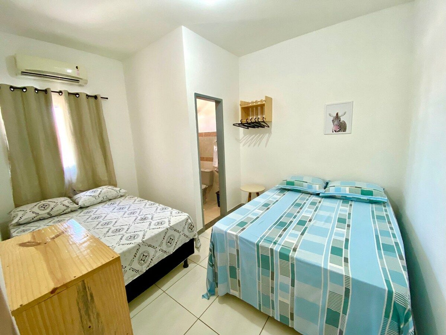 O espaço é composto por sala de estar integrada com a cozinha tendo sofa retrátil, mesa com 6 cadeiras confortáveis, mesa escrivaninha com cadeira ergonômica e TV SMART 32’. Cozinha completa com área de serviço anexa e banheiro social. Possui ainda dois quartos, sendo um suíte e com ar-condicionado. Disponibiliza-se ainda ventilador. O imóvel está localizado no Residencial Morar Bem, sendo bastante tranquilo e perfeito para passar uma bela temporada.