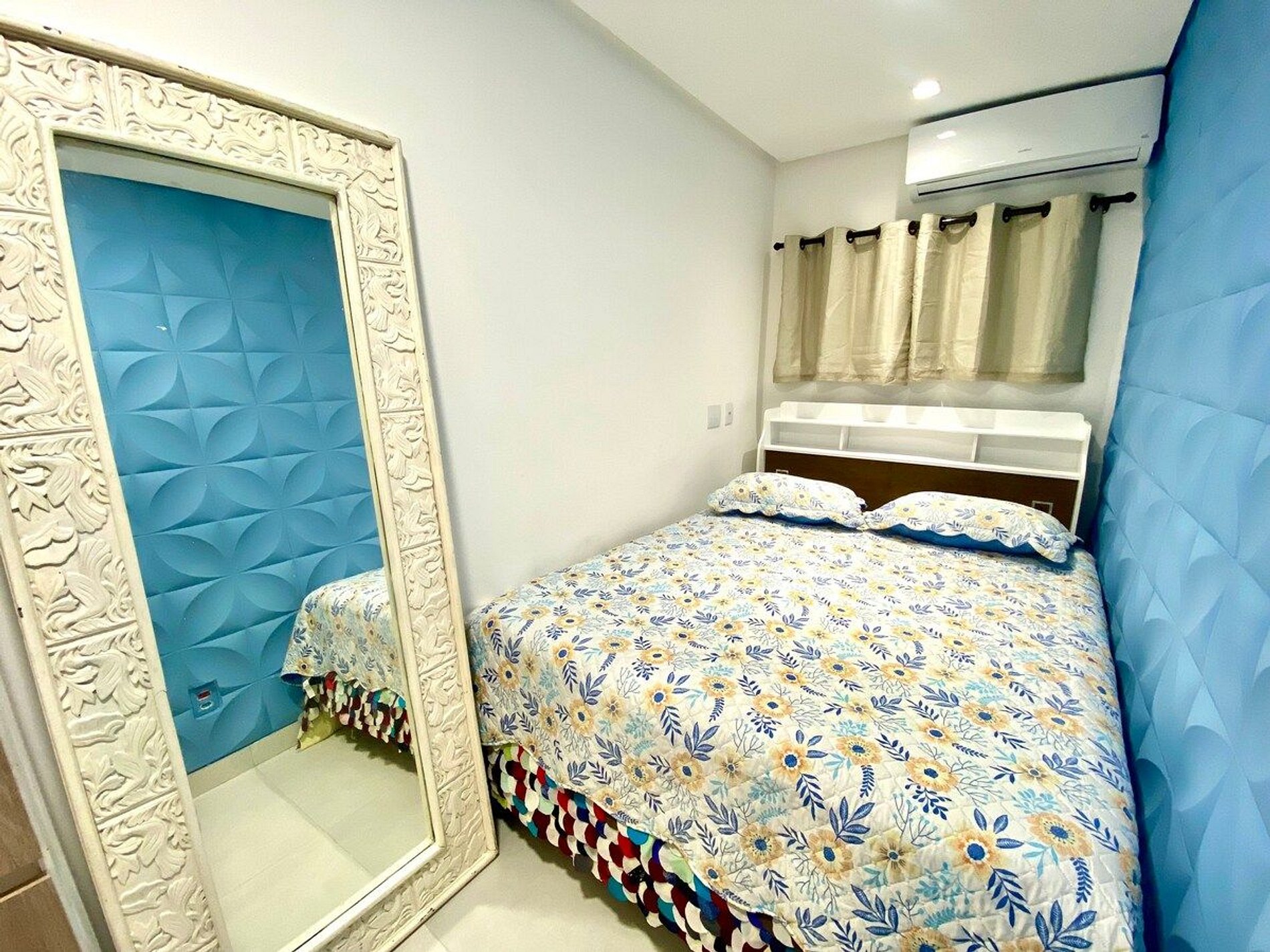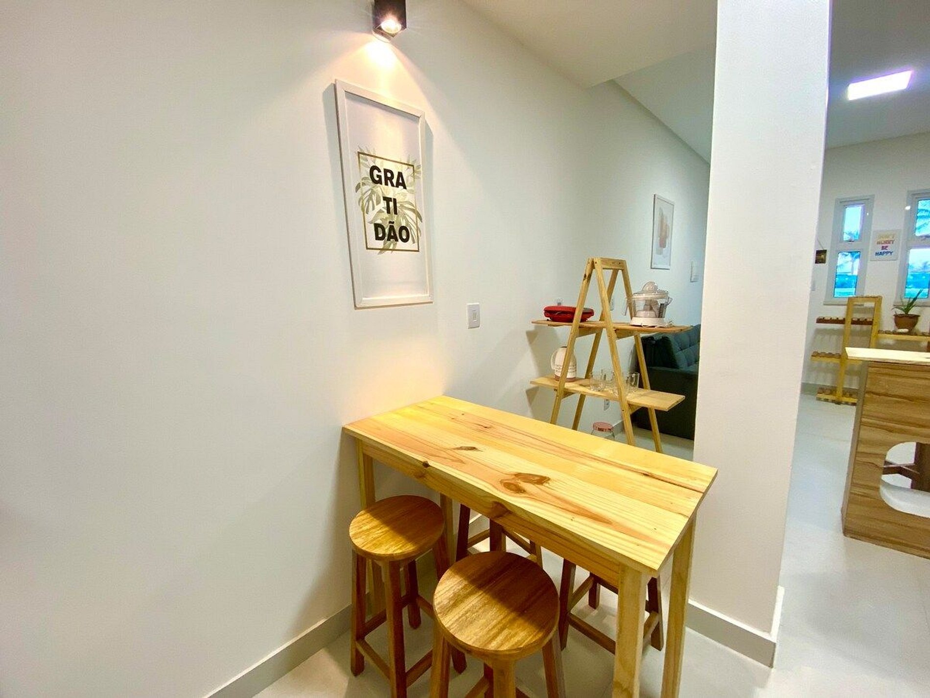 O espaço é composto por sala de estar, cozinha integrada completa com bastante utensílios e um banheiro privativo. Área de serviço com pia lavanderia e tanque de lavar roupas. Possui um quarto e ele tem ar-condicionado, excelente cama de casal, espelho grande e guarda-roupas. Temos apenas duas janelinhas na frente do apartamento, uma entrada de ventilação pequena na área de serviço e uma janela maior aos fundos que dá vista a outra propriedade mas que possui cortina e pode ficar aberta com bastante segurança. Como o ambiente fica um pouco fechado nós resolvemos instalar ar-condicionado na sala de estar mas mesmo assim não indicamos o local para quem não se sente bem em ambientes não tão amplos e arejados. Disponibiliza-se ainda ventilador. Temos TV SMART 32’. O local é bastante tranquilo e perfeito para passar uma bela temporada.