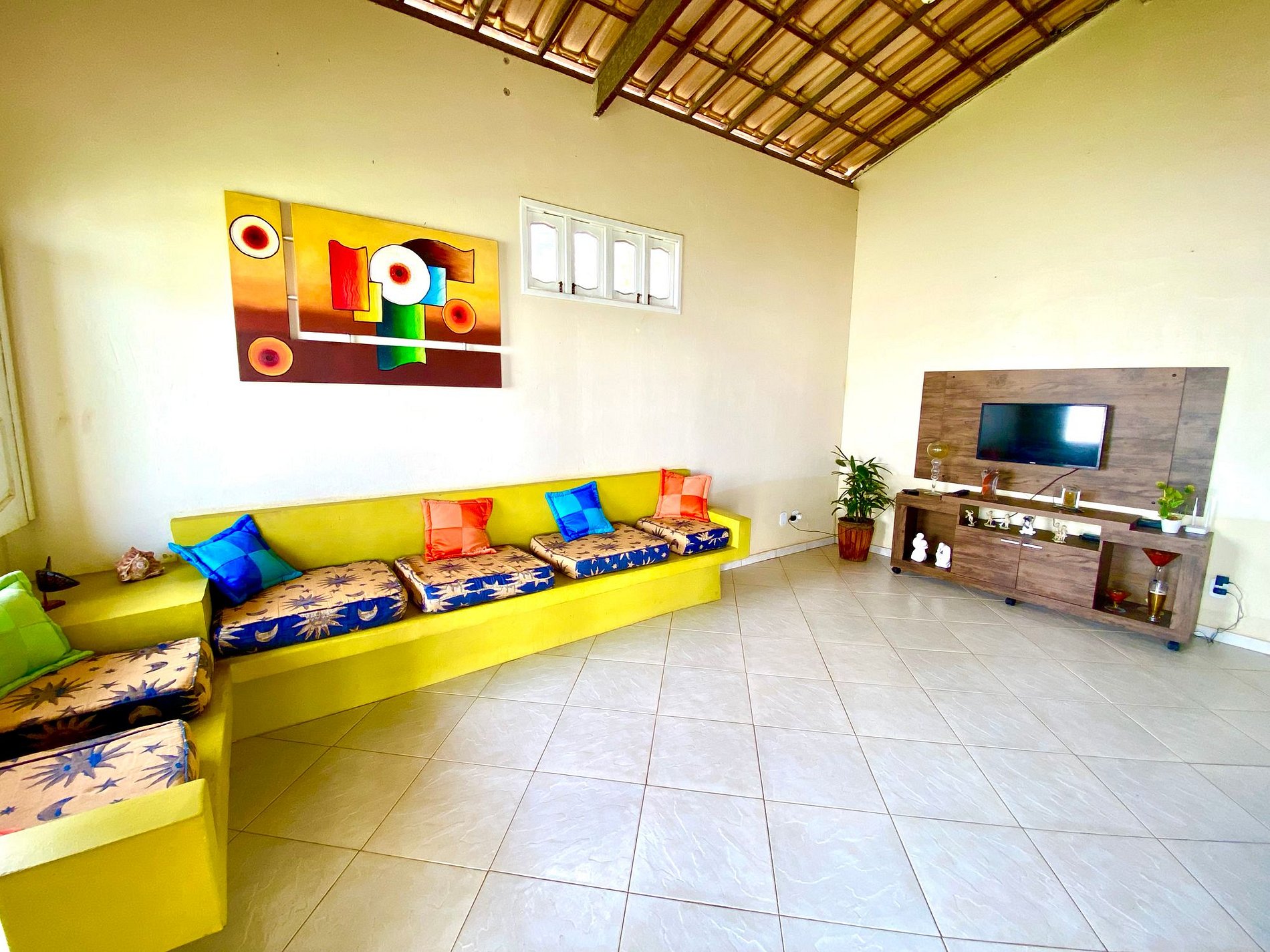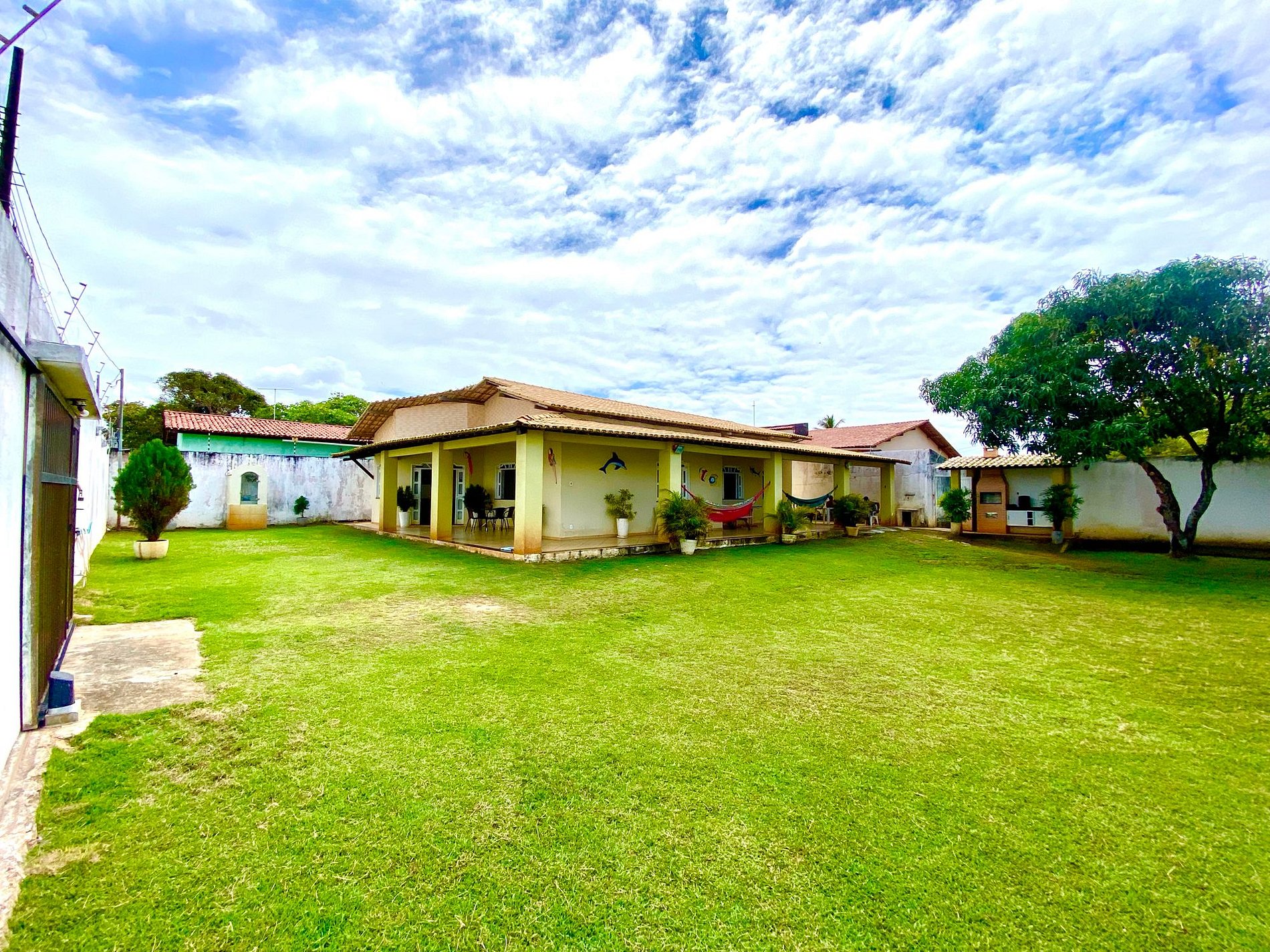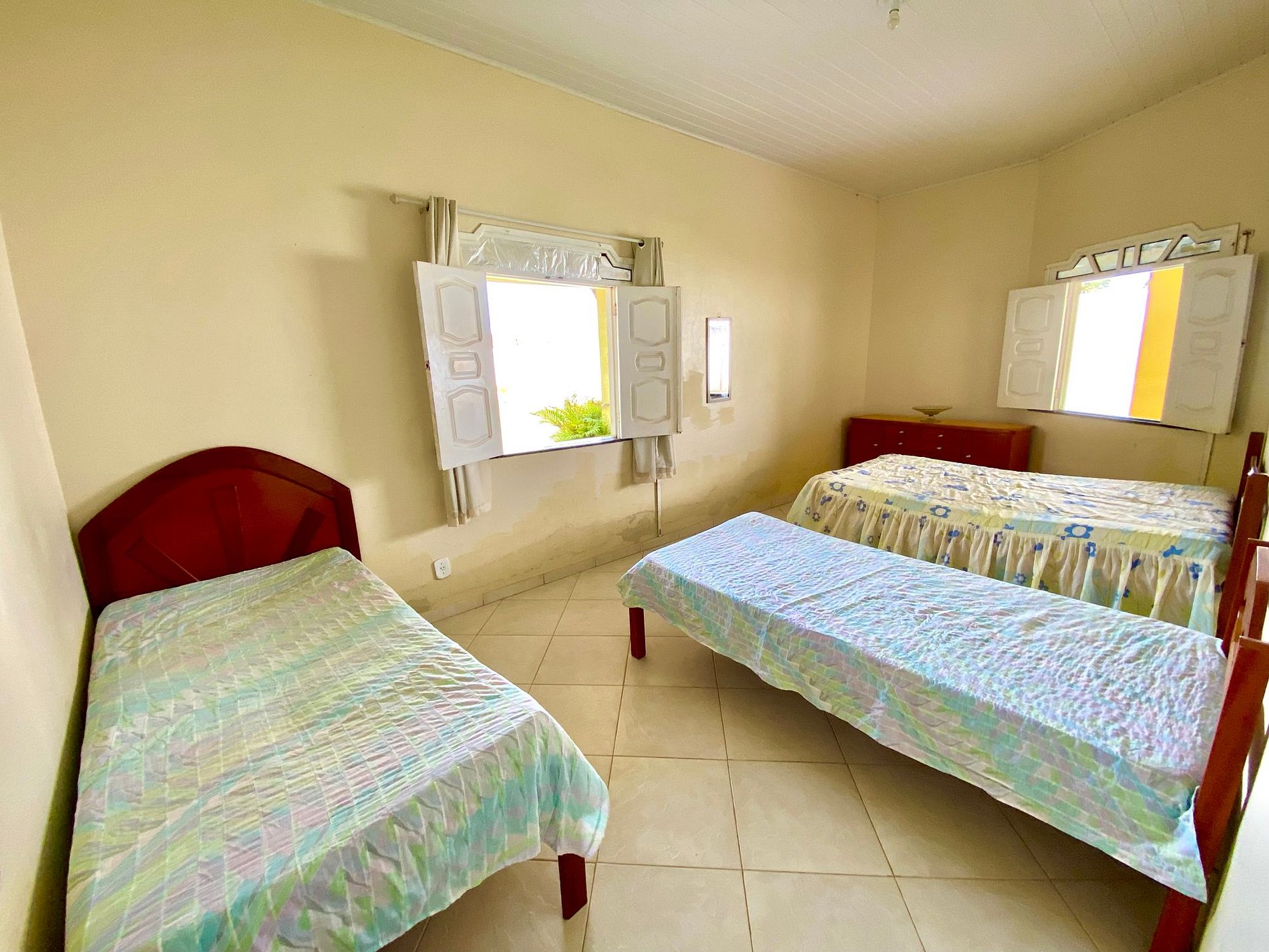 A casa possui sala de estar ampla com sofá em alvenaria e TV HD 32’, área de jantar com mesa e seis cadeiras, além de cozinha completa e área de serviço anexa com máquina de lavar roupas e banheiro. Possuímos três quartos sendo um suíte e todos com ar-condicionado. O quarto suíte tem cama de casal, o segundo e terceiro quarto possuem camas de solteiro, casal e ventiladores portáteis. Banheiro social com chuveiro elétrico. O local é bastante arejado com tudo muito limpo e organizado para a melhor comodidades dos nossos hóspedes.
