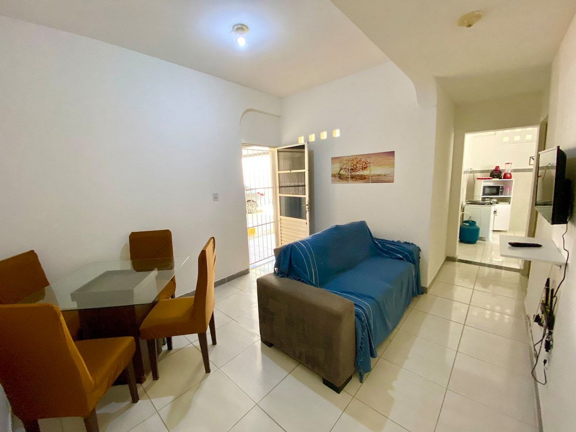 O espaço é composto por sala de estar com sofa retrátil, mesa com 4 cadeiras confortáveis e TV SMART 32’. Cozinha completa com área de serviço anexa e banheiro social. Possui ainda dois quartos, sendo apenas um quarto suíte e com ar-condicionado. Disponibiliza-se em um dos quartos ventilador. O imóvel está localizado no Residencial Morar Bem, sendo bastante tranquilo e perfeito para passar uma bela temporada.