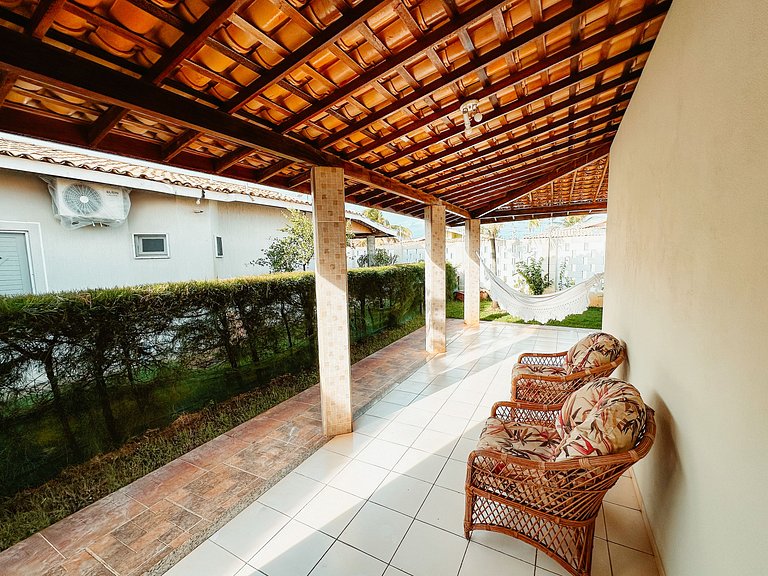 No espaço interno o ambiente é super confortável com três quartos sendo dois suítes. Todos os quartos possuem guarda-roupas. Temos AR-CONDICIONADO NOS TRÊS QUARTOS e ventiladores a disposição na casa. Contamos com uma maravilhosa sala de estar com SOFÁS CONFORTÁVEIS, conjunto de mesa com cadeiras e SMARTV 58’’. Temos ainda uma super cozinha bem arejada e equipada com utensílios básicos necessários para uma ótima estadia, com DUAS GELADEIRAS sendo uma duplex, microondas, filtro de água, armário amplo e adaptado, FOGÃO 6 BOCAS COM FORNO, pia acoplada a balcão. Internamente a casa contamos com o total de TRÊS BANHEIROS completos.
